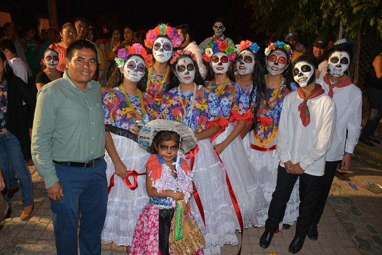 En la Cabecera Municipal se realizó la comparsa que con música alegró las calles hasta llegar al panteón, donde a un costado de la entrada del recinto, el escenario se vistió de gala con el concurso de disfraces, enfocado a “Catrinas y Catrines”, con el fin de recuperar las tradiciones mexicanas. El club de danza se lució con un ensamble especial, y a la par, se realizó en escenario alterno, la proyección de una película.