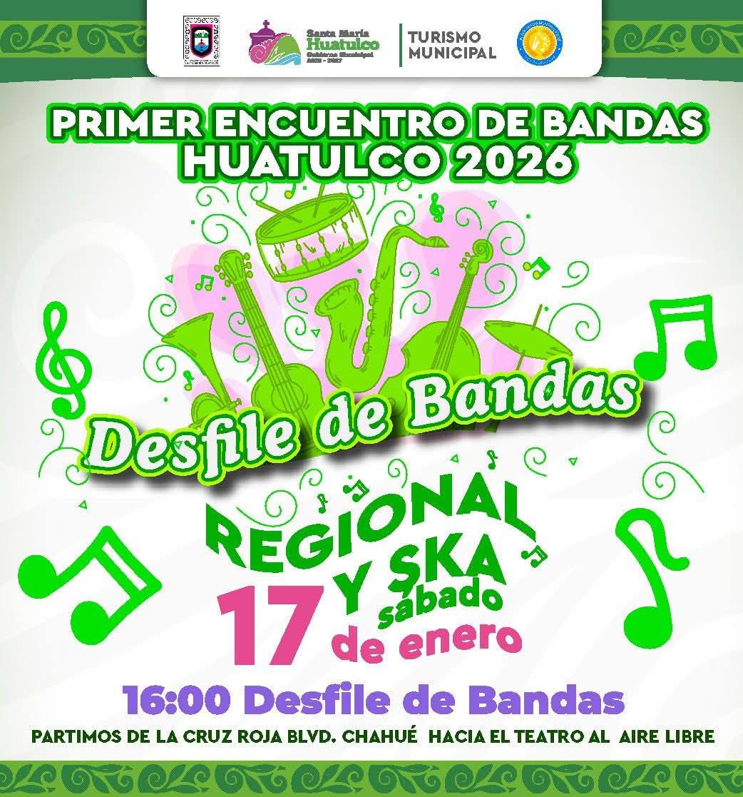 El Gobierno Municipal de Santa María Huatulco invita a la ciudadanía a ser parte del Primer Encuentro de Bandas Huatulco 2026, un evento lleno de energía, talento y tradición.