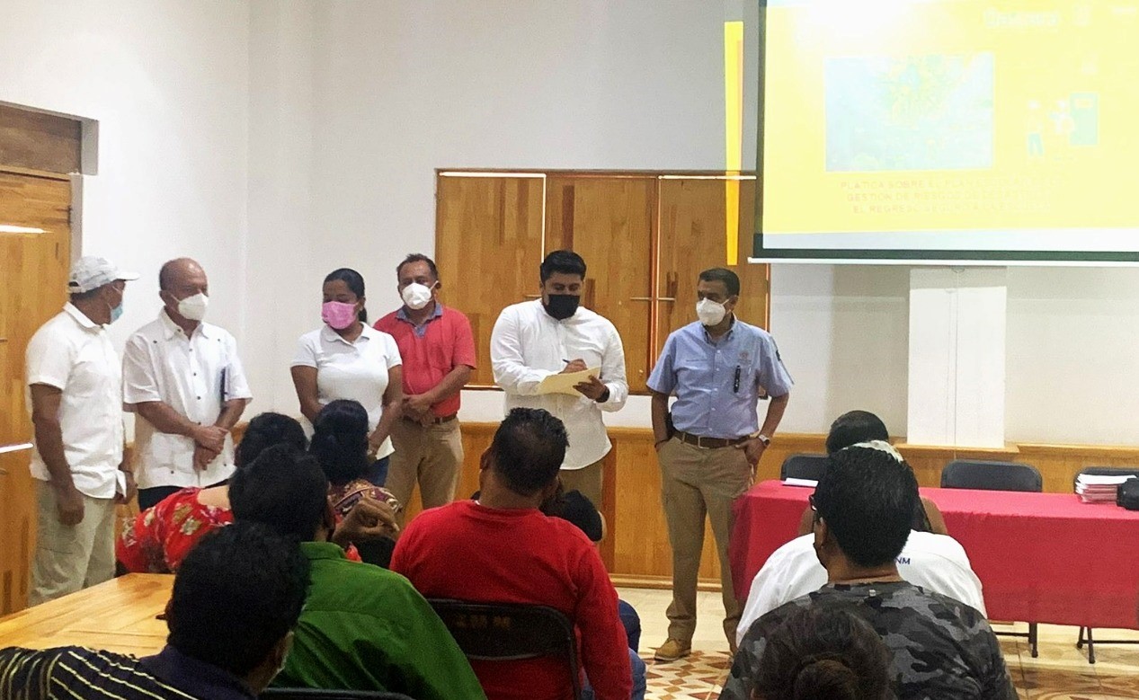 Personal del Área de Protección Civil y Emergencia Escolar en coordinación con la autoridad municipal, brinda a la comunidad escolar información sobre los protocolos de higiene y de las recomendaciones para continuar con el retorno seguro, responsable y ordenado a clases presenciales, modalidad que algunos planteles ya han adoptado en esta zona de la entidad; además de abordar aspectos de la atención emocional.