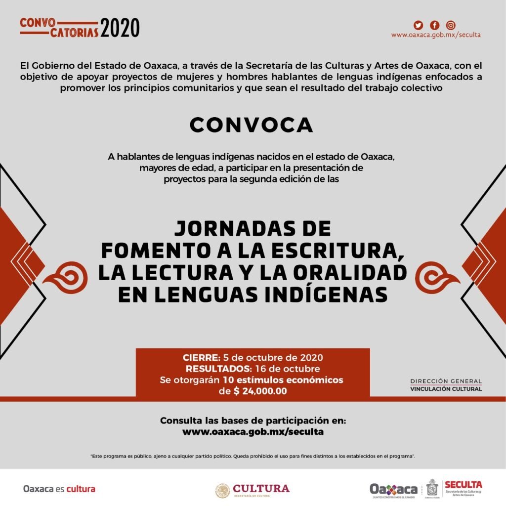 La convocatoria contempla 10 estímulos económicos por 24 mil pesos cada uno, los participantes tienen para registrarse el 5 de octubreOaxaca de Juárez, Oax. 17 de septiembre 2020.- El Gobierno del Estado de Oaxaca a través de la Secretaría de las Culturas y Artes de Oaxaca (Seculta), presentó la convocatoria Jornadas de Fomento a la escritura, la lectura y la oralidad en lenguas indígenas con el objetivo de apoyar proyectos en las ocho regiones de la entidad.