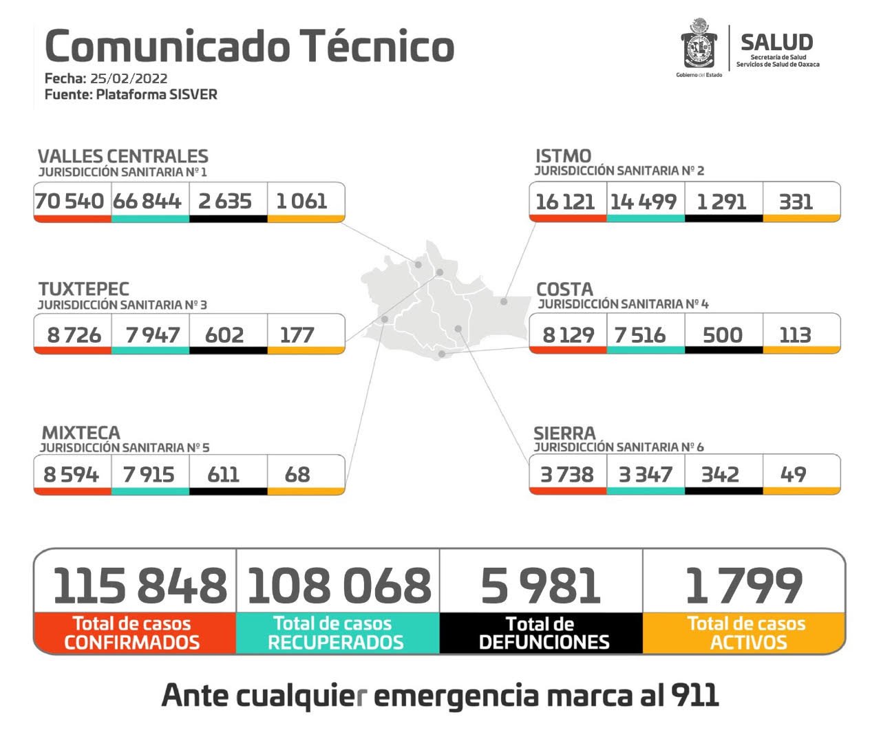 Lo anterior, ya que este 25 de febrero se notificaron 378 casos nuevos de la enfermedad y cinco decesos más, con esta última cifra Oaxaca alcanzó un acumulado de 5 mil 981 fallecimientos.
