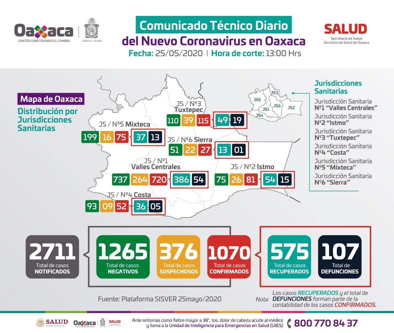 Señaló también que la región de Valles Centrales continúa siendo la zona urbana con la incidencia más alta de contagios al registrar 720 casos, de los cuales 54 derivaron en decesos, cifra que representa el 67% del global de confirmados en todo el territorio oaxaqueño al corte del 25 de mayo del presente año.