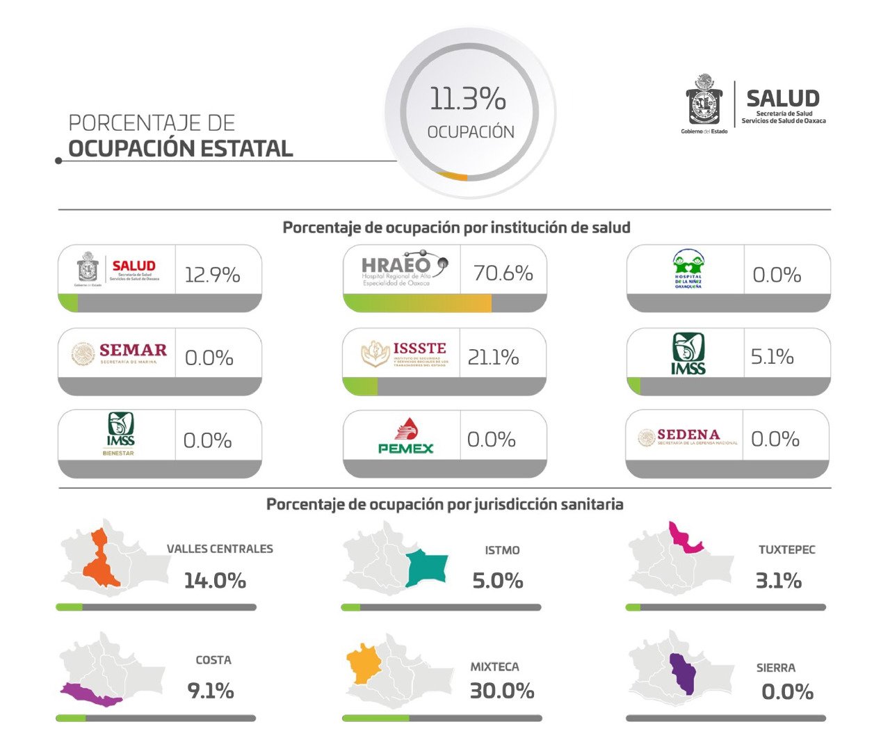 Este lunes, la red hospitalaria para la atención de pacientes con COVID-19 en Oaxaca, se encuentra de manera general al 11.3% de ocupación, ya que durante la última jornada se notificó un nuevo ingreso, para un total de 44 personas que se encuentran recibiendo atención especializada.