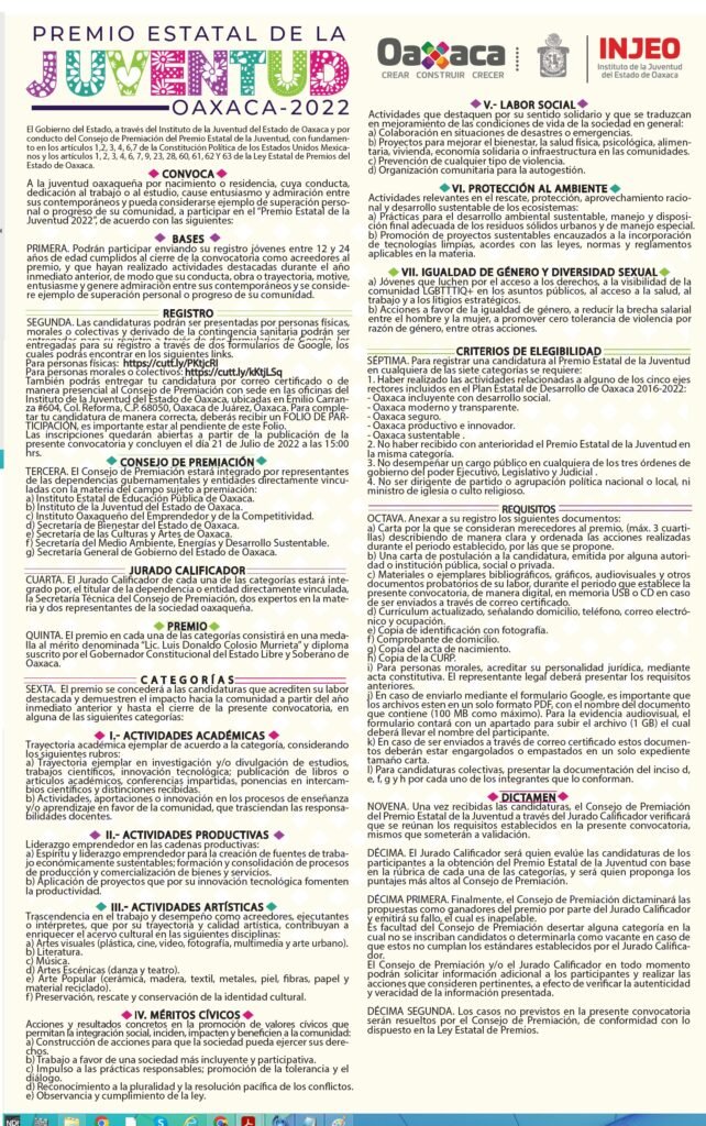 La convocatoria que se encuentra abierta hasta el 21 de julio de 2022, llama a participar a la juventud oaxaqueña (por nacimiento o residencia) de entre 12 y 24 años de edad, así como a las organizaciones juveniles o colectivos que hayan realizado actividades destacadas durante el año anterior inmediato; de modo que han logrado distinguirse en su comunidad de manera notable por sus actos, obras, proyectos y/o por una trayectoria ejemplar a favor de la sociedad y se consideren merecedores para recibir dicho premio.