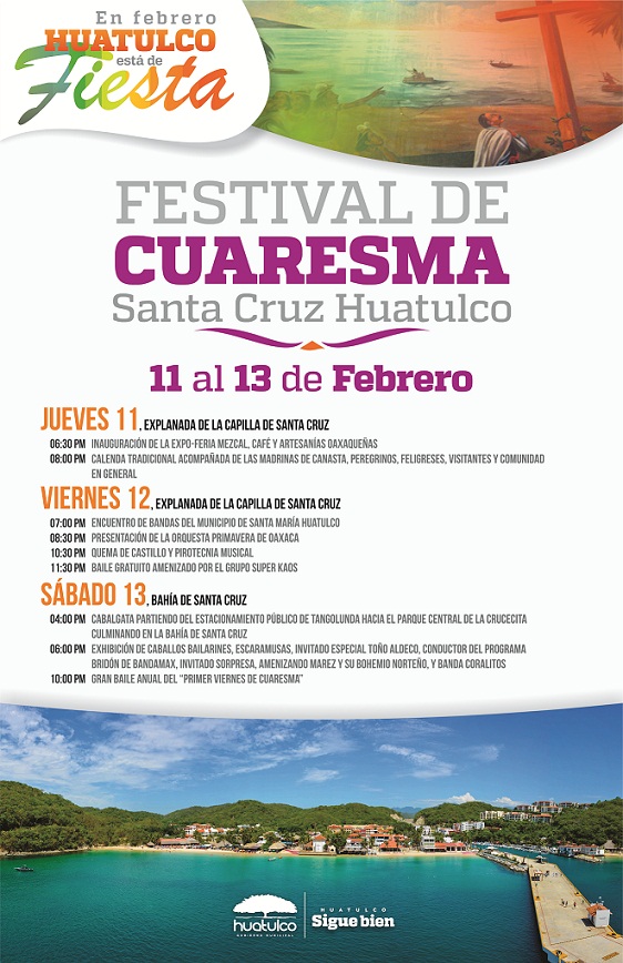 Febrero 10 de 2016.- Del 11 al 13 de febrero, la Agencia de Santa Cruz Huatulco se viste de fiesta con el Festival de Primer Viernes de Cuaresma, evento que organiza el Gobierno Municipal, presidido por Darío Pacheco Venegas, en el que destacan una gran verbena popular, la presentación de la Orquesta Primavera de Oaxaca, cabalgatas, la tradicional quema del castillo y un espectáculo de pirotecnia musical.