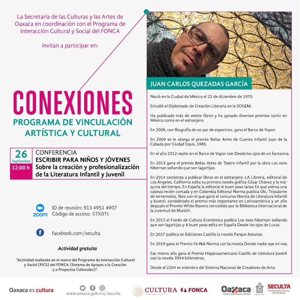 El Gobierno del Estado a través de la Secretaría de las Culturas y Artes de Oaxaca (Seculta), invita a las y los oaxaqueños a participar en la conferencia “Escribir para niños y jóvenes”