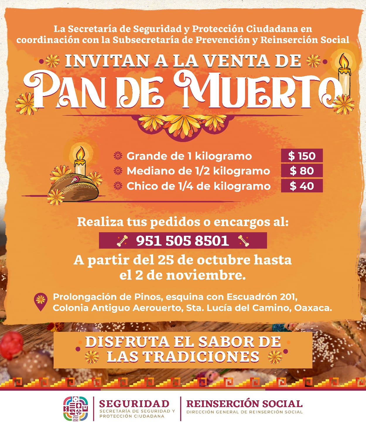 La SSPC informa que la venta de este tradicional pan está abierta al público a través de pedido previo en las instalaciones de la DEMA ubicadas en Prolongación de Pinos esquina Escuadrón 201, colonia Antiguo Aeropuerto, en Santa Lucía del Camino o al número 951 505 85 01.