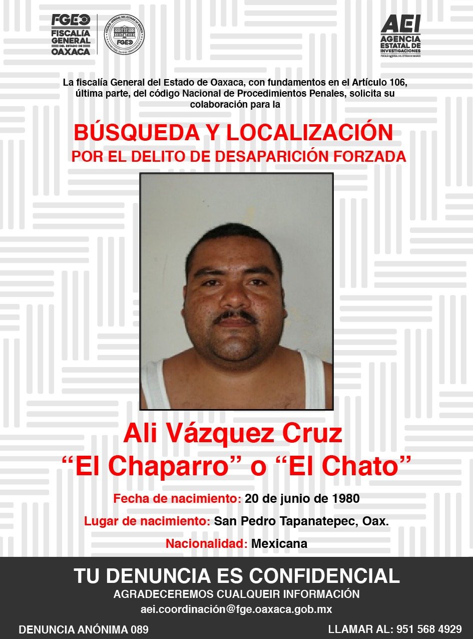 La Fiscalía General del Estado de Oaxaca (FGEO) solicita el apoyo, para la búsqueda y localización de la persona ALI VÁZQUEZ CRUZ “EL CHAPARRO” o “EL CHATO”, mismo que es señalado como probable responsable del delito de DESAPARICIÓN FORZADA.