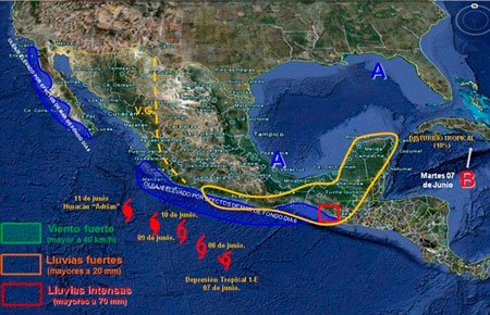 NOTA: EL DÍA DE AYER LA DEPRESIÓN TROPICAL NO. “1-E” A LAS 22:00 HRS (03 GMT) SE INTENSIFICÓ A LA TORMENTA TROPICAL “ADRIAN”. HOY A LAS 10:00 HRS (15 GMT) SU CENTRO FUE SITUADO EN LA LAT. 12.9° N Y LA LONG. 100.8° W A 436 KM (235 MILL AS) AL SUR-SUROESTE DE PTO. MÁRQUEZ, GRO., Y A 575 KM (311 MILLAS) AL SUR-SURESTE DE LÁZARO CÁRDENAS, MICH. PRESENTABA UN CENTRO DE BAJA PRESIÓN DE 994 hPa., CON VIENTOS MÁXIMOS SOSTENIDOS DE 111 KPH (60 NUDOS) Y RACHAS DE 139 KPH (75 NUDOS), SE DESPLAZA HACIA EL NOR-NOROESTE A 7 KPH (4 NUDOS) PARALELA A LAS COSTAS DEL PACÍFICO MEXICANO SE EMITEN AVISOS