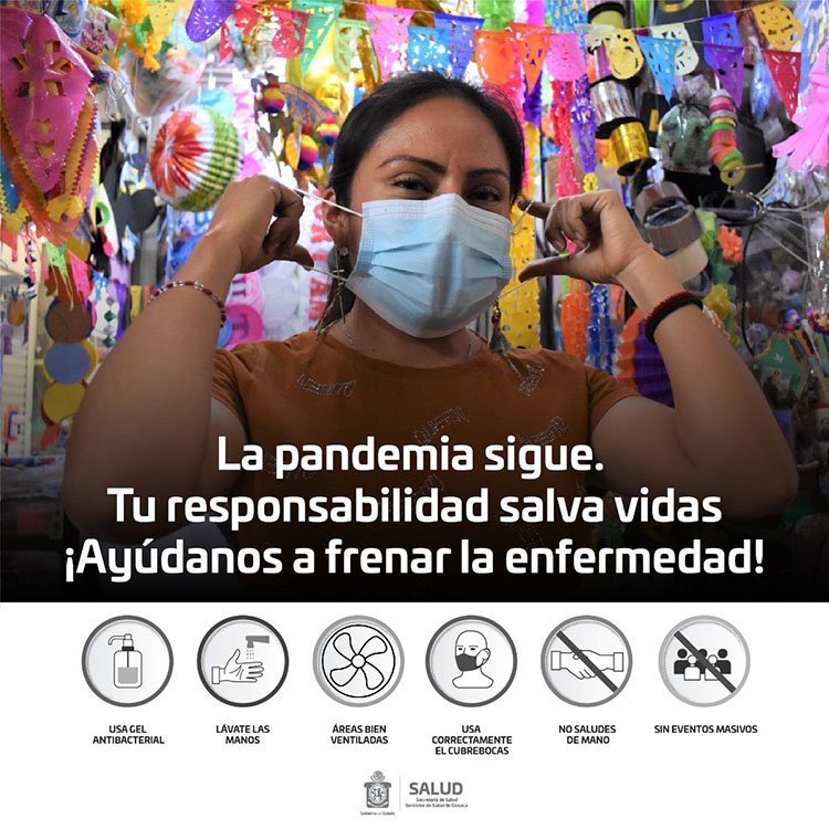 Oaxaca de Juárez, Oax. 17 de abril de 2022.- Para permanecer con la tendencia baja de contagios del SARS-CoV-2, hospitalizaciones y defunciones es necesario que la población, sin excepción alguna continúe aplicando todas las medidas de prevención, destacaron los Servicios de Salud de Oaxaca (SSO).