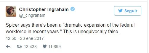 El secretario de prensa de la Casa Blanca, Sean Spicer, afirmó falsamente que la multitud en el National Mall (en donde fue la ceremonia de investidura) era “la audiencia más grande que alguna vez había sido testigo de una inauguración”. (21 de enero)