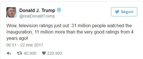 Trump afirmó que su inauguración atrajo a 11 millones más de espectadores que Barack Obama en 2013. No fue así y la audiencia para la primera inauguración de Obama, en 2009, fue aún mayor. (22 de enero)