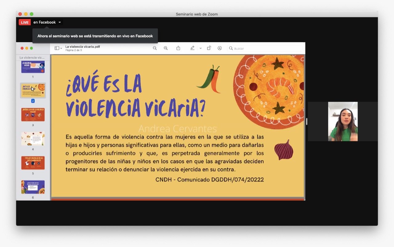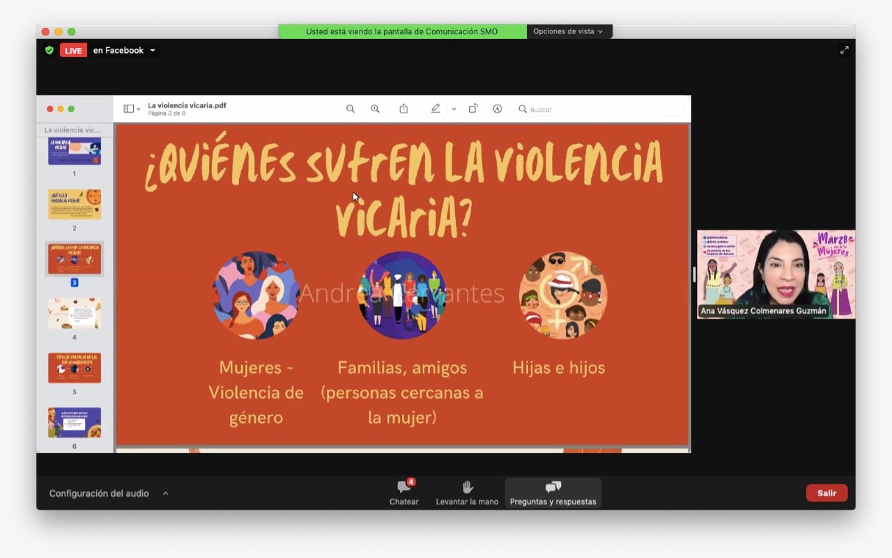 Oaxaca de Juárez, Oax. 18 de marzo de 2022. A fin de visibilizar la violencia que tiene como objetivo dañar a la mujer a través de acciones derivadas de la manipulación de sus seres queridos, especialmente a sus hijas e hijos, la Secretaría de las Mujeres de Oaxaca (SMO) realizó la conferencia virtual sobre “Violencia Vicaria”, a cargo de la abogada especialista en género y derechos humanos Andrea Cervantes Castañeda.