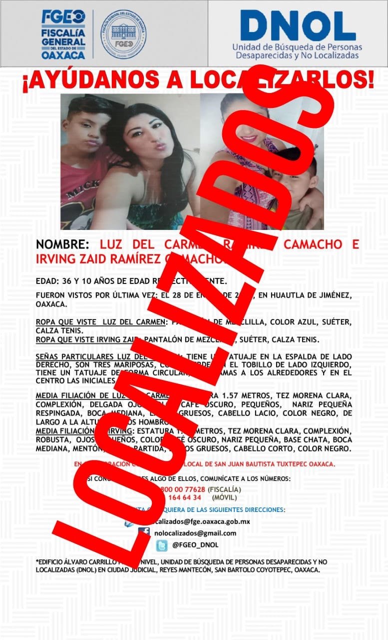 Finalmente, el pasado 1 de febrero, elementos de la Agencia Estatal de Investigaciones (AEI) localizaron a la mujer y a su hijo en Huautla de Jiménez; ambos se encuentran en perfecto estado de salud.