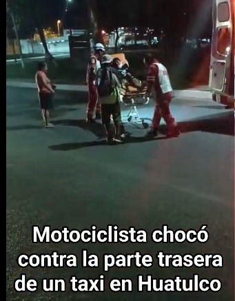Un motociclista que circulaba sobre el boulebar Chahue chocó contra la parte trasera de un taxi del sitio Vicente Guerrero.Esto fue frente al Hotel A.m y los semáforos , al lugar llegaron paramédicos de la cruz roja #Huatulco
