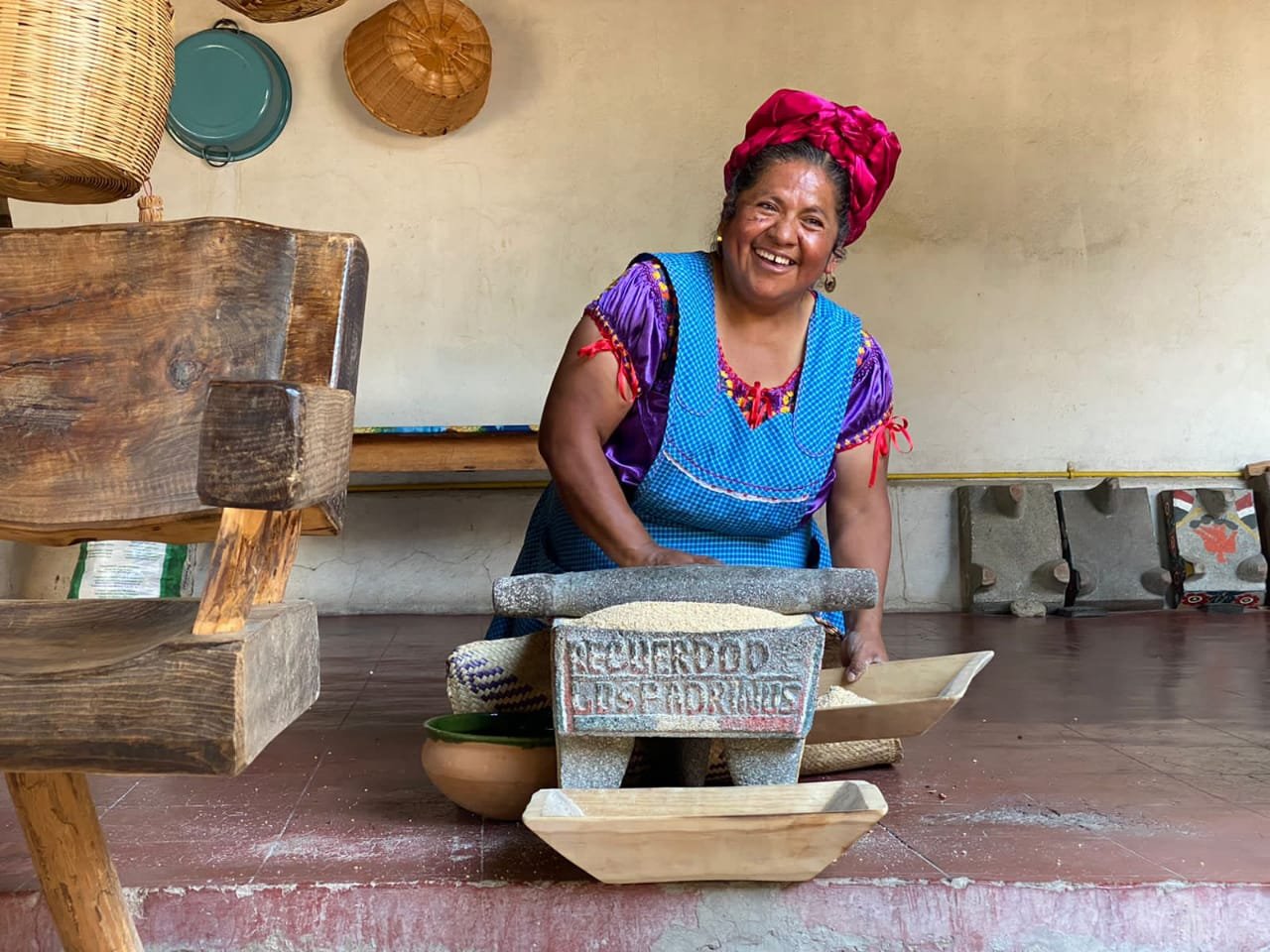 Abigail recuerda que cuando era niña su padre le obsequió una piedra de río que utilizaba para moler maíz y darle de comer a los pollos del traspatio de su casa; a los seis años ya preparaba tortillas y conocía los ingredientes para la segueza y el mole negro. Hoy transmite con maestría el uso de utensilios ancestrales como el metate en donde muele maíz, chocolate, chiles o el molcajete para preparar salsas con ingredientes locales.