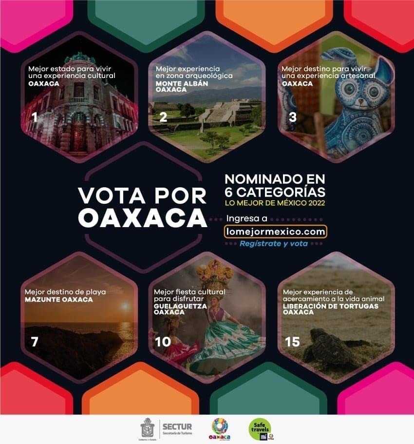 El Pueblo Mágico de Mazunte como “Mejor destino de playa”; la Guelaguetza está nominada como “Mejor fiesta cultural para disfrutar”; y con la liberación de tortugas en las costas de Oaxaca, la categoría “Mejor experiencia de acercamiento animal”.