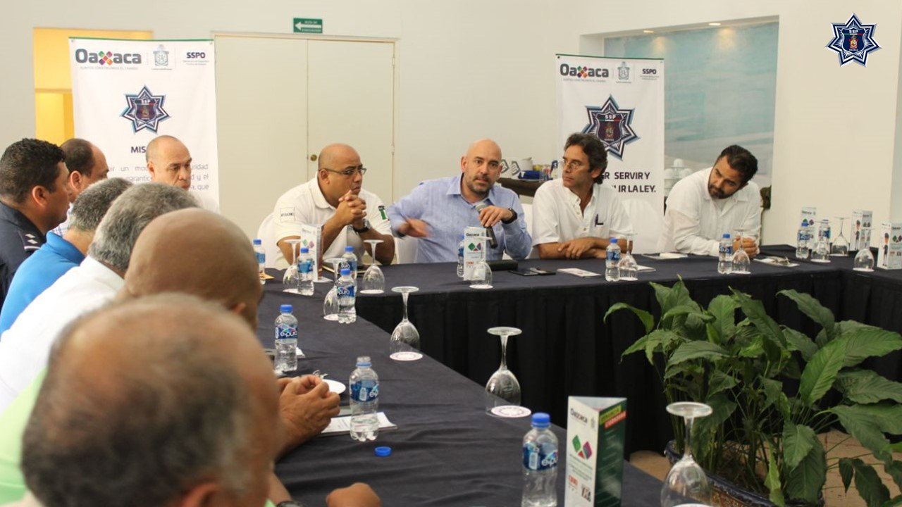 Oaxaca de Juárez, Oax. 26 de enero de 2018. Con el objetivo de escuchar y atender las necesidades del sector hotelero y demás empresarios en materia de seguridad pública en la zona de Huatulco, personal de la Secretaría de Seguridad Pública de Oaxaca (SSPO), encabezada por su titular José Raymundo Tuñón Jáuregui, participó en una reunión estratégica.