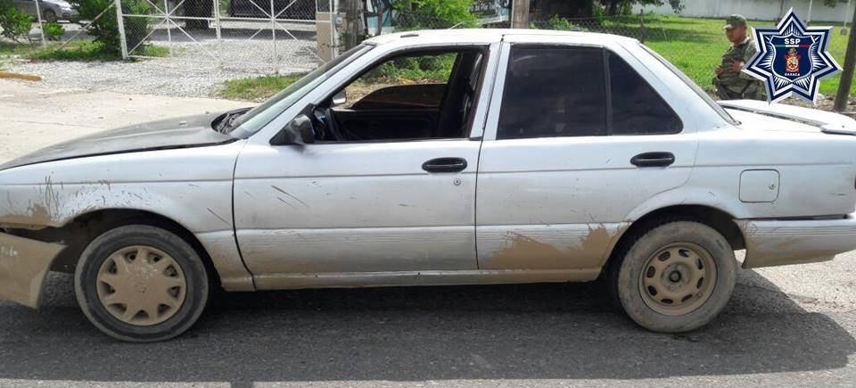 Más tarde, a las 11:50 horas, en la carretera local tramo Juchitán -Ixtepec, a la altura de la rotonda del monumento a Juárez de El Espinal, fue asegurado el vehículo marca Nissan, tipo Tsuru, con placas de circulación MZH 7062, por presentar reporte de robo vigente, de acuerdo con el Sistema Plataforma México.