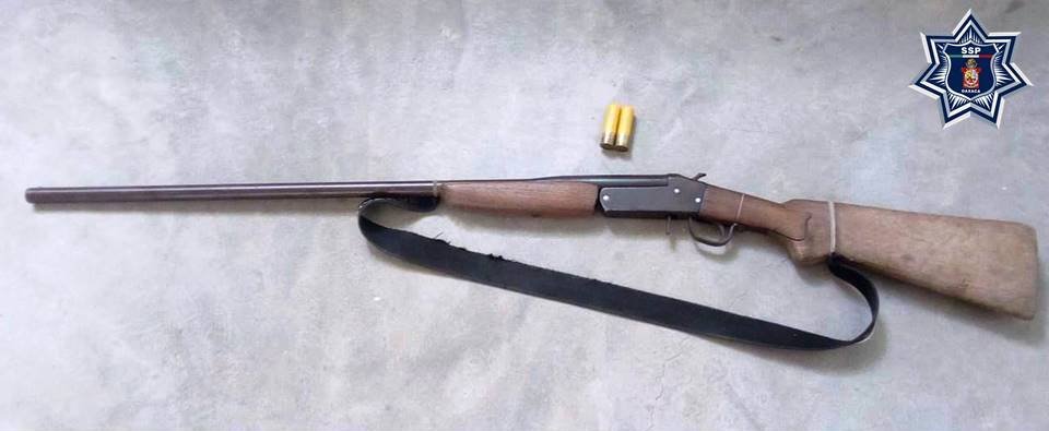 Así también, alrededor de las 08:00 horas de este lunes en el camino de terracería que conduce de Santiaguito, Jicayán, al río de esa localidad, los policías estatales realizaron la detención de Franco L. J., de 53 años de edad, por portar sin el permiso que exige la Ley Federal de Uso de Armas de Fuego y Explosivos, una escopeta calibre 20 milímetros, sin marca, modelo ni matrícula, con dos cartuchos útiles del mismo calibre.