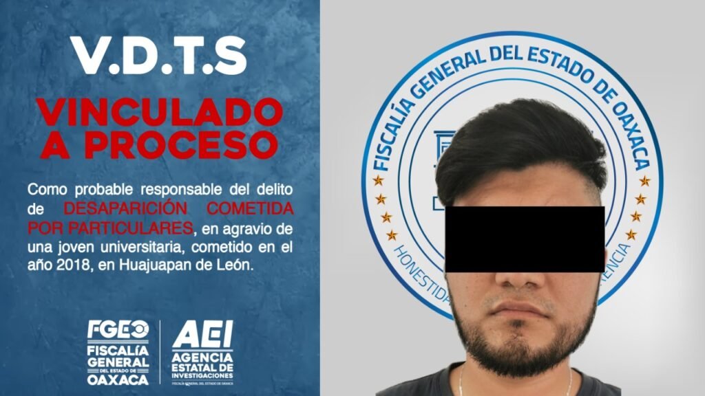 Oaxaca de Juárez, Oax., 29 de septiembre de 2020.- En su firme compromiso de procurar justicia en favor de mujeres víctimas de delitos, la Fiscalía General del Estado de Oaxaca (FGEO), aprehendió y logró obtener del Juzgado de Control auto de vinculación a proceso contra el masculino V. D. T. S., como probable responsable del delito de desaparición por particulares de la joven universitaria J. A. V. O., cometido en agosto de 2018, en Huajuapan de León, región Mixteca.