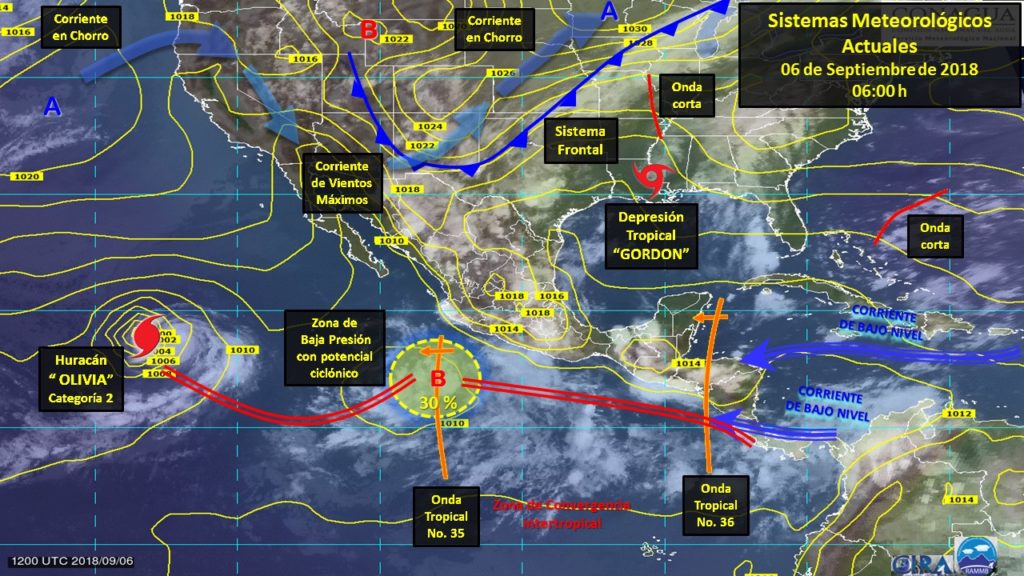 Para hoy, la muy activa onda tropical No. 35 frente a las costas de Jalisco; se mantendrá asociada a una zona de inestabilidad con potencial ciclónico. Por otra parte, la onda tropical No. 36 sobre el oriente de la Península de Yucatán y zonas de inestabilidad atmosférica superior sobre el interior del territorio, favorecerán tormentas acompañadas de actividad eléctrica, rachas fuertes de vientos y posibles granizadas en el noroeste, occidente, centro y sur del país.