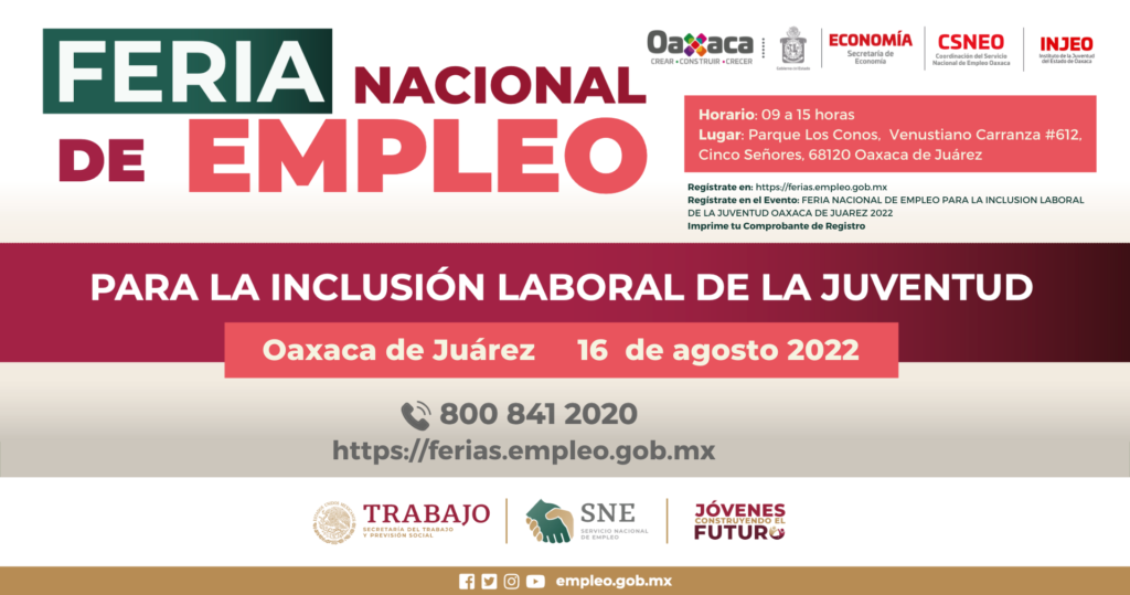 Las y los interesados en participar en la “Feria para la Inclusión Laboral de la Juventud”, tendrán que registrarse en el sitio: https://ferias.empleo.gob.mx; también podrán llamar al 800 841 2020; o acudir a las oficinas de la CSNEO ubicadas en las ocho regiones de la entidad, para recibir orientación por parte de consejeros laborales.