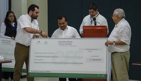 Lunes 03 de noviembre de 2014.- Gracias a las gestiones que se realizaron ante la Comisión Federal de Electricidad (CFE), con el fin de obtener recursos para instaurar obras de bien en diversos puntos de la localidad, el Presidente Municipal de Santa María Huatulco, Darío Pacheco Venegas, recibió dos millones de pesos, los cuales se destinarán a dos proyectos de gran relevancia en el municipio.