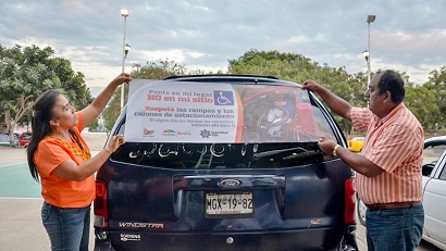 En este marco, María de la Luz Díaz Ruiz informó que se trabaja en la campaña “Ponte en mi lugar, no en mi sitio”, con el fin de hacer conciencia en los automovilistas de no obstruir rampas y áreas de acceso, lo cual es de vital importancia para una persona que se transporta en silla de ruedas. Por lo anterior, se inició con la colocaron microperforados en automóviles de quienes se sumaron a esta importante campaña de sensibilización.