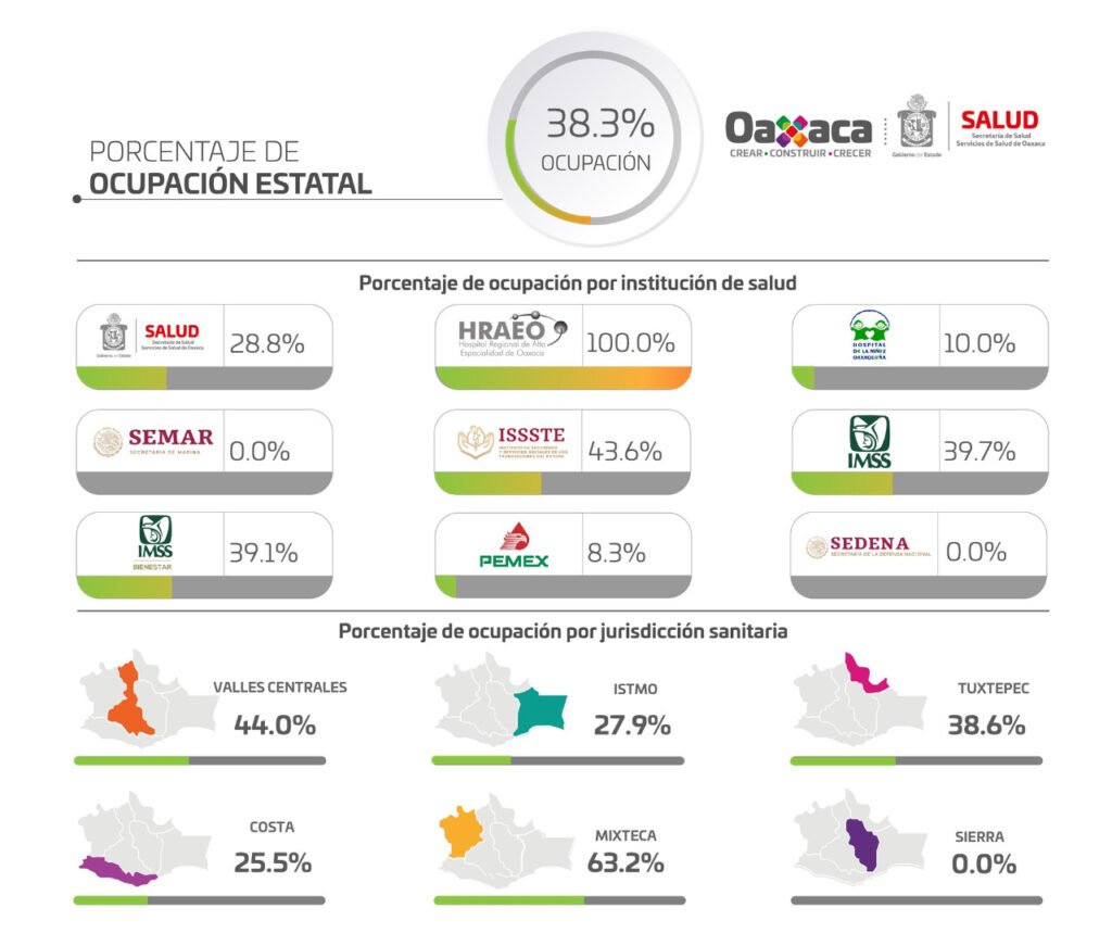 Hay una ocupación hospitalaria global del 38.3%, la Jurisdicción Sanitaria de la Mixteca registra un 63.2% de camas ocupadas por pacientes con COVID-19, seguido de Valles Centrales con 44%, y Tuxtepec con 38.6%.
