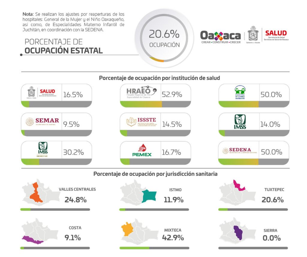 Este martes se tiene el registro de dos nuevos hospitalizados de un total de 87 que se encuentran recibiendo atención médica, hay 336 camas disponibles de 423 destinadas para la emergencia sanitaria, lo que hace que haya un porcentaje global del 20.6% de ocupación de la red hospitalaria, siendo las Jurisdicciones Sanitarias de la Mixteca con 42.9%, Valles Centrales con 24.8%, y Tuxtepec con 20.6%, las de mayor saturación.