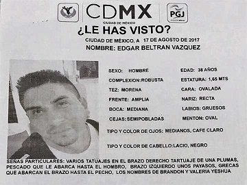 Edgar Beltrán Vázquez, alias, El primo Beltrán, jefe de sicarios de Felipe de Jesús Pérez Luna, El Ojos, y encargado de la seguridad de Miguel Ángel Pérez Rodríguez, hijo del capo abatido el pasado 20 de julio, fue reportado como desaparecido desde el 14 de agosto ante la Procuraduría de Justicia capitalina.