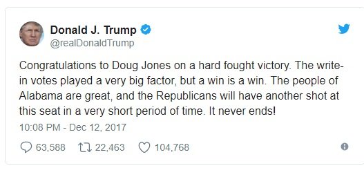 En Twitter, Trump felicitó a Jones por su “dura victoria” y lamentó los más de 22.000 votos (1,7 %) que los electores depositaron para candidatos que no participaron en la contienda a través del método “write-in”.