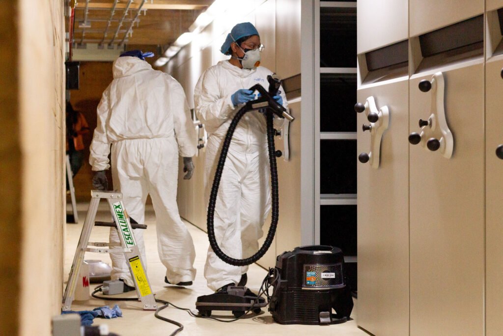 La limpieza tiene como fin retirar el polvo que se acumula en los espacios, debido a que este material orgánico atrae insectos o fauna nociva que puede perjudicar la conservación de los documentos. Para prevenir que el material resguardado sea dañado, se llevan a cabo dos limpiezas: una limpieza profunda y una superficial de mantenimiento preventivo.
