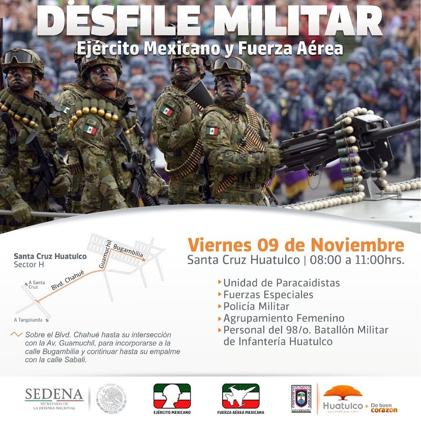 Noviembre 06 de 2018.- La Secretaría de la Defensa Nacional a través de la comandancia del 98/o. Batallón de Infantería, hace una cordial invitación a la población en general, para presenciar el desfile cívico militar que tendrá lugar a partir de las 0800 horas del día 9 de noviembre de 2018, en la plaza de Santa Cruz Huatulco, Oax.