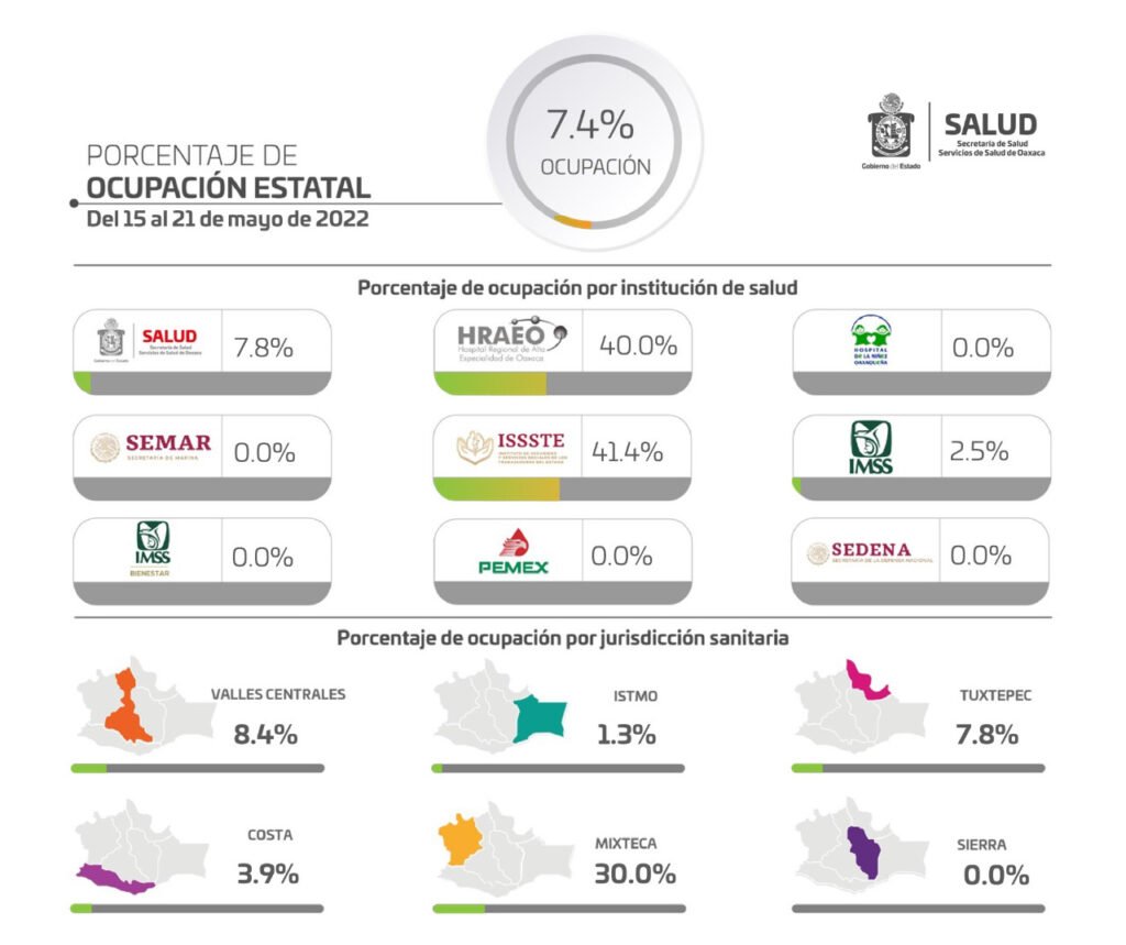 Oaxaca de Juárez, Oax. 22 de mayo de 2022.- Los Servicios de Salud de Oaxaca (SSO), informan que durante el período comprendido del 15 al 21 de mayo, la entidad registró un acumulado de 120 mil 343 casos confirmados del virus SARS-CoV-2, de los cuales 168 se contabilizaron en los últimos siete días.