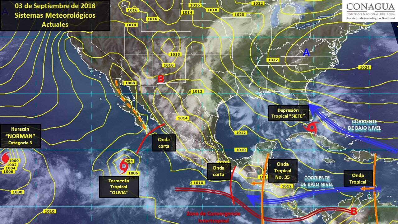 Para hoy, la onda tropical No. 35 se desplazará sobre le Península de Yucatán, mientras que zonas de inestabilidad atmosféricas superior afectarán los estados del norte, noreste y sureste de México, aunado a la entrada de aire cálido y húmedo proveniente de ambos océanos, y a la circulación de la Tormenta Tropical “OLIVIA” a 785 km al suroeste de Cabo San Lucas, B.C.S. dichos sistemas mantendrán el siguiente potencial de lluvias, las cuales estarán acompañadas de actividad eléctrica, vientos fuertes y posibles granizada, se prevén tormentas muy fuertes a puntuales intensas (75 a 150 mm) en Chiapas; tormentas fuertes a puntuales muy fuertes (50 a 75 mm) en Chihuahua, Coahuila, Durango, Guerrero, Oaxaca, Tabasco, Campeche, Yucatán y Quintana Roo; intervalos de chubascos con tormentas puntuales fuertes (25 a 50 mm) en Baja California Sur, Nuevo León, Tamaulipas, Nayarit, Jalisco, Michoacán, Estado de México, Ciudad de México, Morelos, Puebla y Veracruz, y lluvias con intervalos de chubascos (5.1 a 25 mm) en zonas de Sonora, San Luis Potosí, Aguascalientes, Zacatecas, Sinaloa, Colima, Guanajuato, Querétaro, Hidalgo y Tlaxcala.