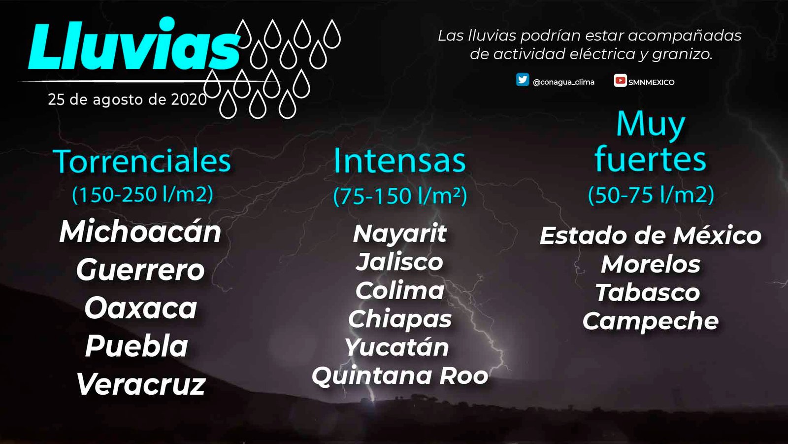 Debido al temporal de lluvias de intensas a torrenciales en entidades del occidente, oriente, sur y sureste de México, y ante el riesgo de deslaves, aumento en los caudales de ríos y arroyos e inundaciones en zonas bajas, se exhorta a la población de los estados mencionados y a la navegación marítima a permanecer atenta a los avisos del Servicio Meteorológico Nacional (SMN) de la Comisión Nacional del Agua (Conagua), y seguir las indicaciones de las autoridades estatales, municipales y de Protección Civil.