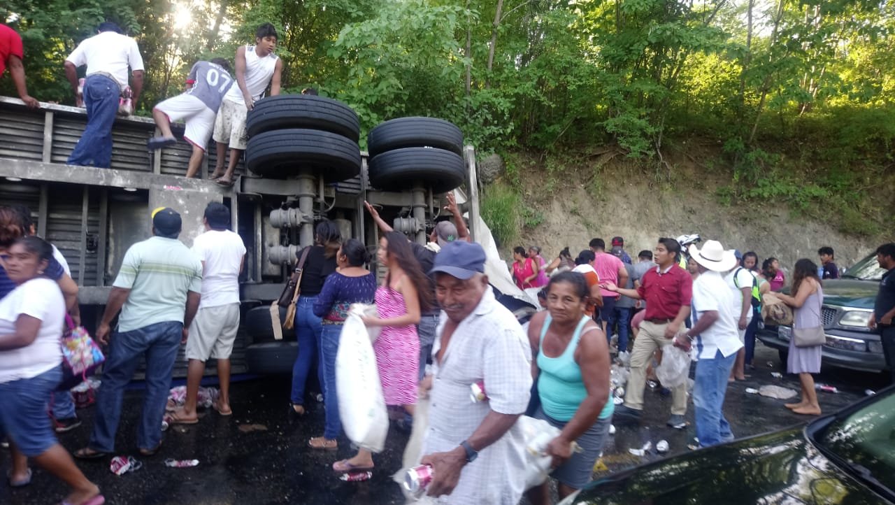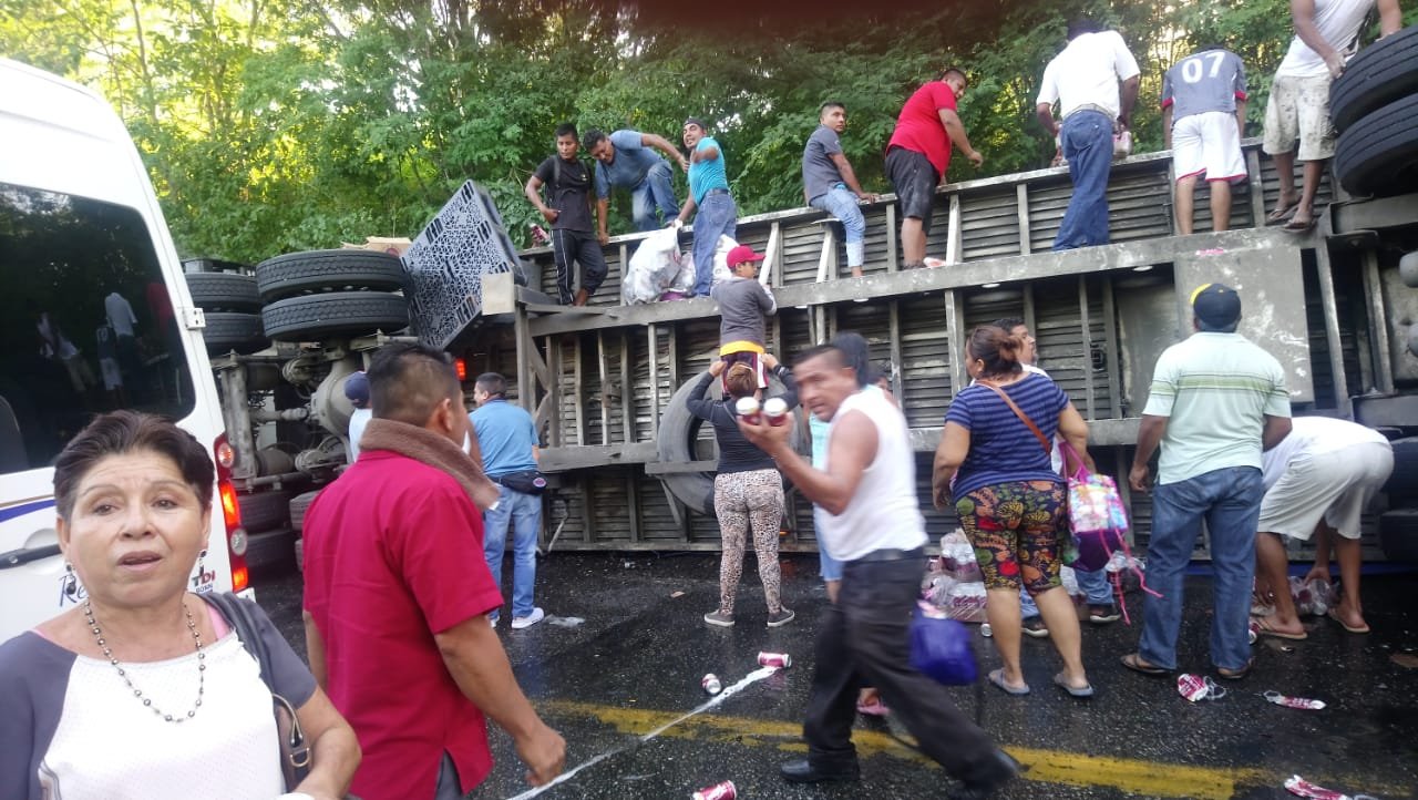 En este accidente se vio a mucha gente de las comunidades cercanas, así como, a los transeúntes haciendo la rapiña del producto que sobre la cinta asfáltica.