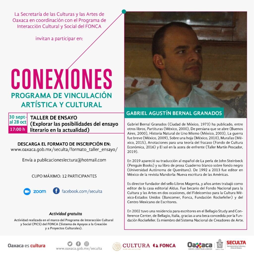 El taller que forma parte de “Conexiones”, Programa de vinculación artística y cultural busca explorar las posibilidades del ensayo en la actualidad y se impartirá de forma gratuita por Gabriel Agustín Bernal Granados, miembro del Sistema Nacional de Creadores de Arte.