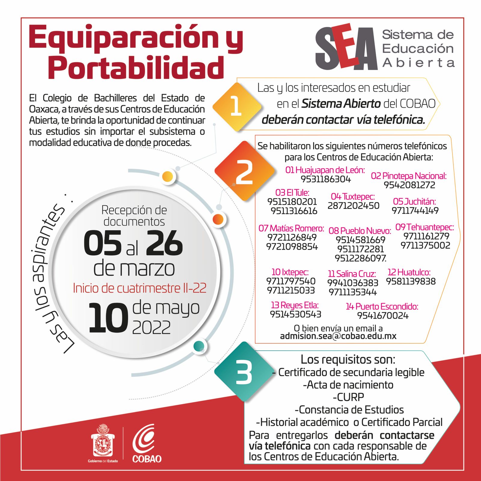 Santa Cruz Xoxocotlán, Oax. 16 de marzo de 2022.- El Colegio de Bachilleres del Estado de Oaxaca (Cobao) a través de su Sistema de Educación Abierta (SEA), comenzó el proceso de equiparación y portabilidad; la recepción de documentos será hasta el 26 de marzo.