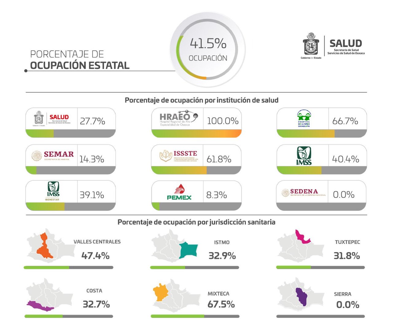 Cuatro Jurisdicciones Sanitarias reportaron debajo del 50% la saturación de camas; Valles Centrales con 47.4%, Istmo con 32.9%, Costa con 32.7% y Tuxtepec con 31.8%, sin embargo, la Mixteca es la de mayor preocupación, ya que los hospitales de la zona están trabajando al 67.5%; a diferencia de la Sierra que se mantiene en 0% de ocupación médica.