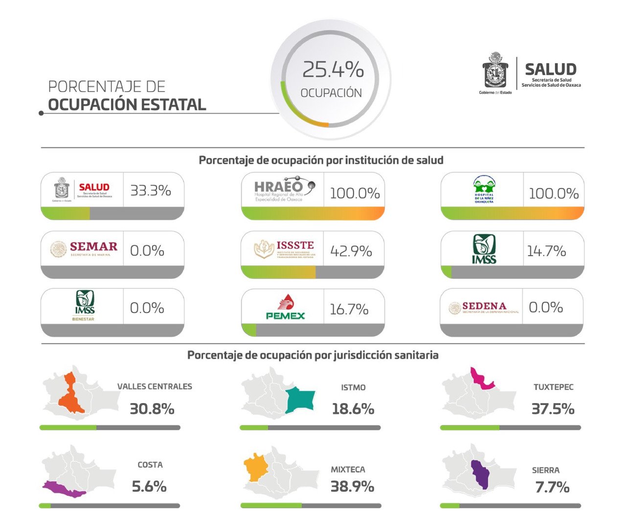 La red hospitalaria se encuentra al 25.4% de ocupación de camas para pacientes que presentan alguna complicación, ocho hospitales se ubican al 100% de su capacidad, y tres pacientes fueron hospitalizados en las última 24 horas, por lo que hay 103 camas disponibles de un total de 406.