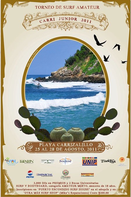 Puerto Escondido.- El Director de Turismo, Raul Noyola invitan al espectacular Torneo Amateur de Surf Carrizalillo Junior 2011 que tiene a bien desarrollarse del 25 al 28 de agosto para los jóvenes amantes del deporte del surf de la región, en la categoría tabla, bodyboard y amateur mixto con una bolsa de 30 mil pesos y 2 becas universitarias.