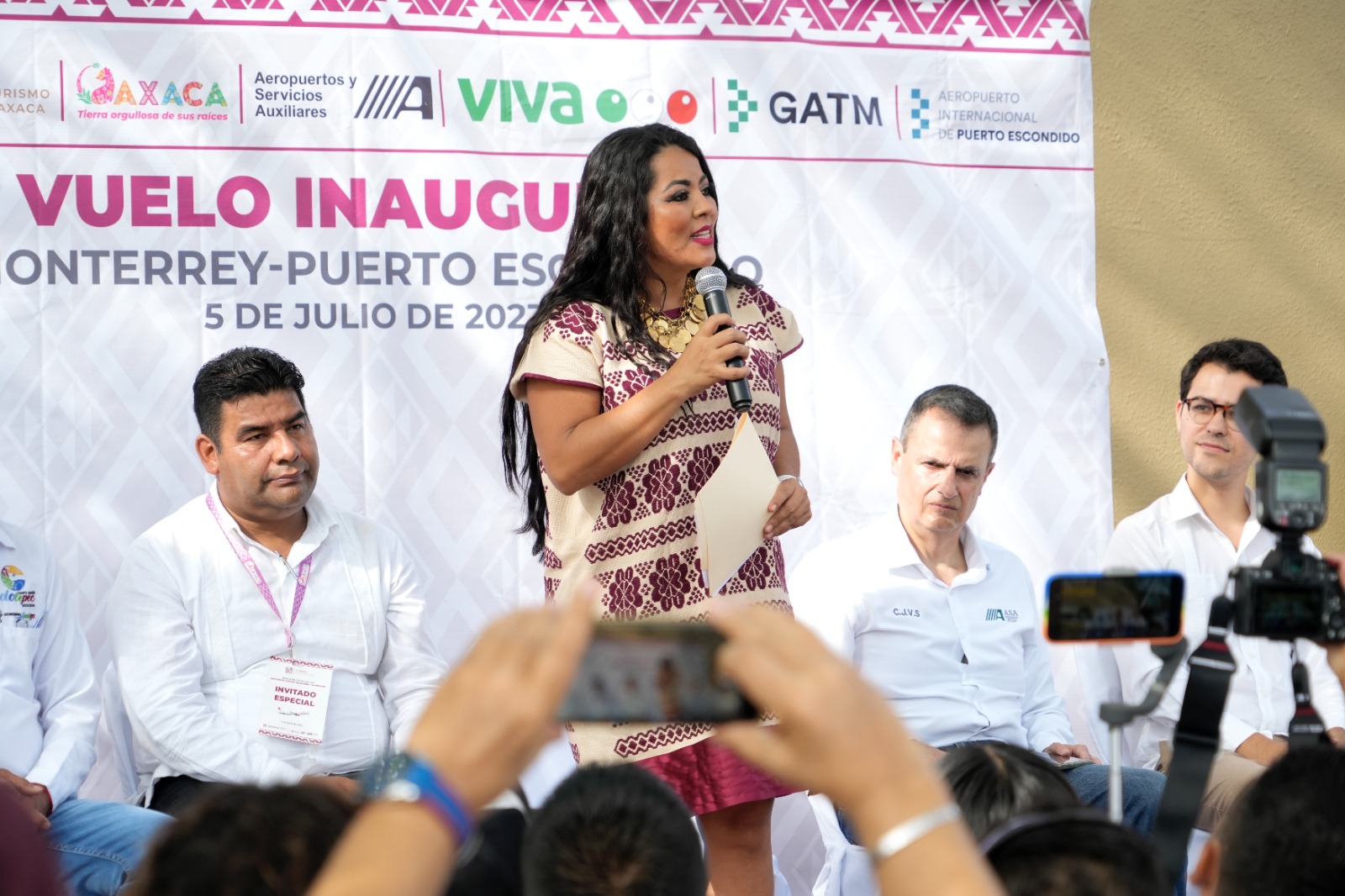 La secretaria de Turismo Saymi Pineda atestiguó el inicio de operaciones de la nueva ruta aérea Monterrey-Puerto Escondido de la aerolínea Viva Aerobus