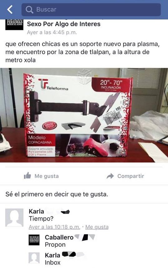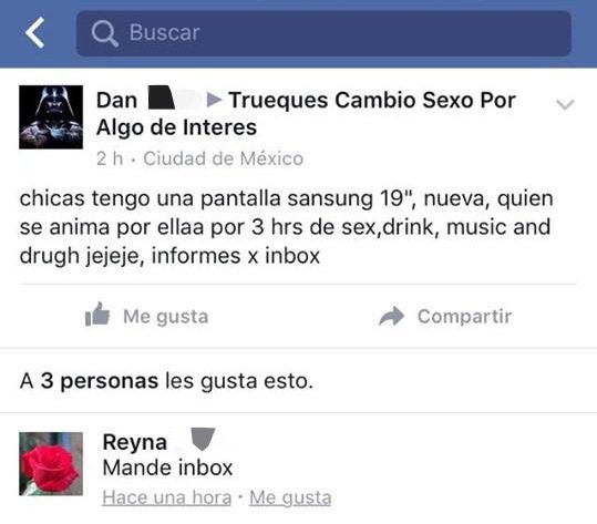 Sin embargo el lugar más directo para intercambiar sexo por artículos o servicios es Facebook. Un grupo cerrado creado apenas hace un par de años bajo el nombre “DF Trueque x sexo” mantiene hasta hoy 118 miembros, incluyendo a Mariana y a Pancho.