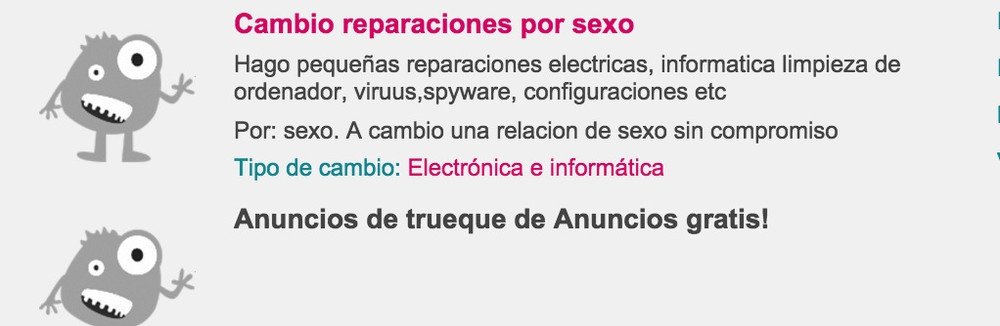 La segunda red en importancia de trueque es ofrezcoacambio.com, que a pesar de que la mayoría de sus miembros son de España, hay algunos anuncios desde México. Aquí, por ejemplo, lo que prolifera son los jardineros y plomeros cachondos y uno que otro nerd de computación que repara celulares, tabletas y laptops a cambio de sexo. En este sitio es tan fácil como llenar la casilla de “ofrezco” o “busco” con la palabra “sexo”.