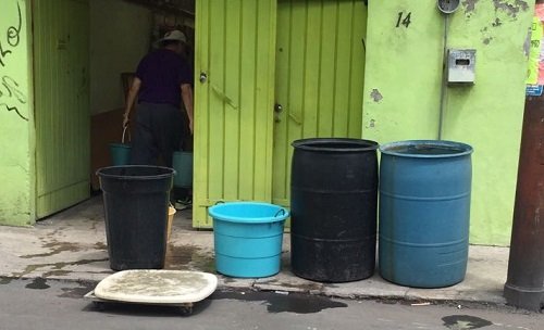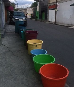 En el Pozo 6 del Sistema de Aguas de la Ciudad de México, ubicada en la Colonia Zapotitlán, personas hicieron fila para conseguir dos cubetas de agua con la que tenían que sobrevivir todo el día.
