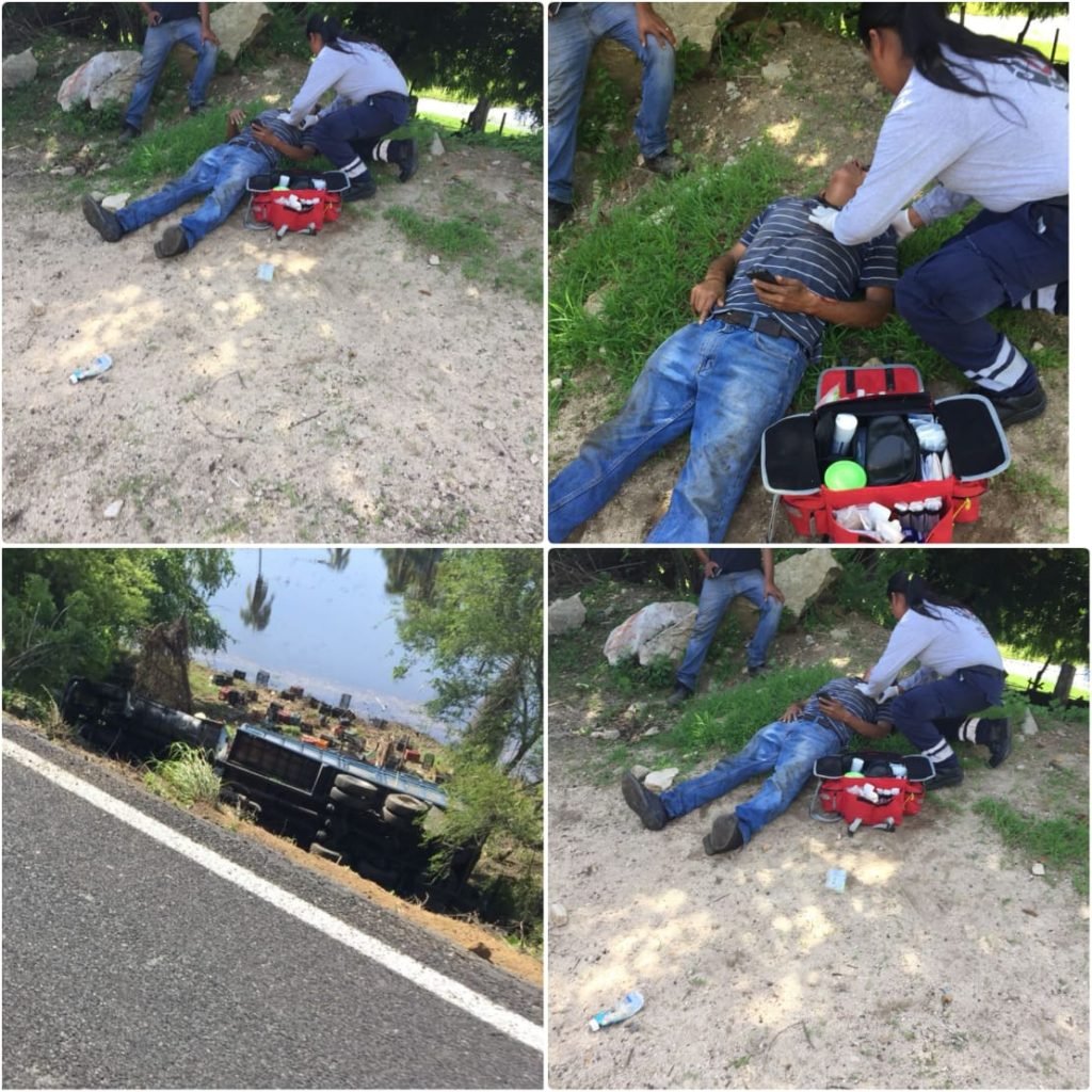 Bahías de Huatulco.-Jovenes voluntarios de Rum delegación Río Grande y Elementos de protección civil de Tututepec acuden a llamado de auxilio por volcadura de torton camión de carga está en la carretera federal 200 en kilómetro 114 en el paraje denominado El mirador de Hidalgo el cual viajaba un masculino de 52años de edad originario de la. Ciudad de Puebla con posible fractura de arcos costales laceraciones y abraciones en diferentes partes del cuerpo fue trasladado a una clínica particular de la ciudad de Puerto Escondido esto para su revisión médica